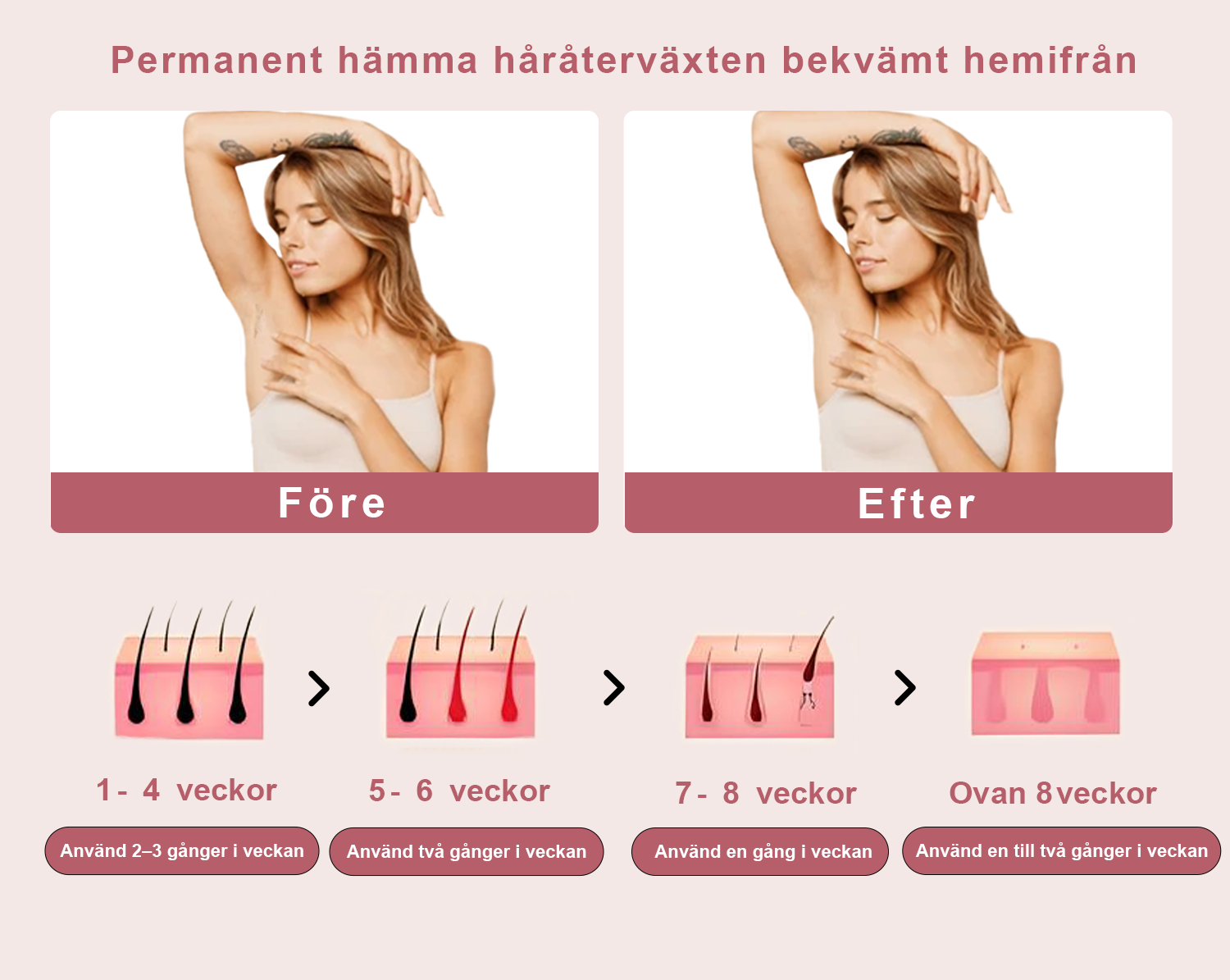 Vid regelbunden användning kan du börja märka minskad hårväxt efter bara några få behandlingar. De flesta användare ser tydligare resultat inom 6–12 veckor, beroende på hur ofta enheten används och behandlingsområdet. Konsekvent användning över tid bidrar till att bibehålla en slätare hud.