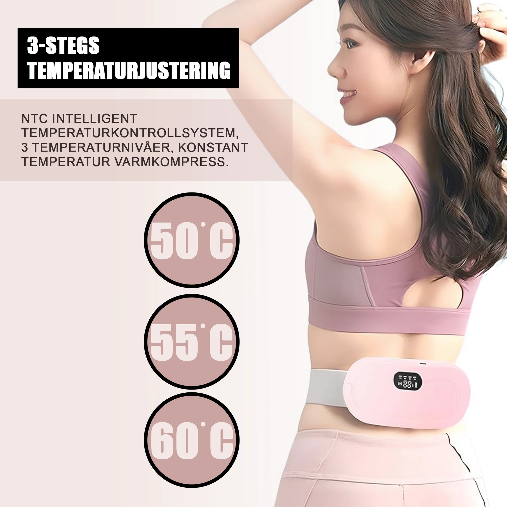 Värmedynan är utformad för att bäras på kroppen och har ett justerbart elastiskt bälte. Detta ger säker placering runt midja, nedre mage eller rygg för handsfree-användning.